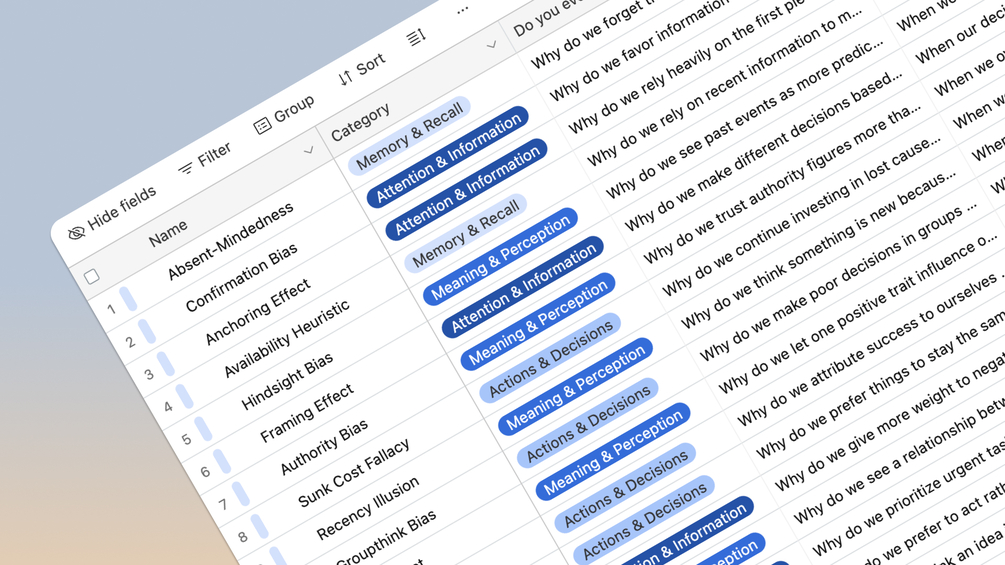 - Vol. 4: Attention & Information — Learn all the biases and heuristics that influence how you process information and attention.